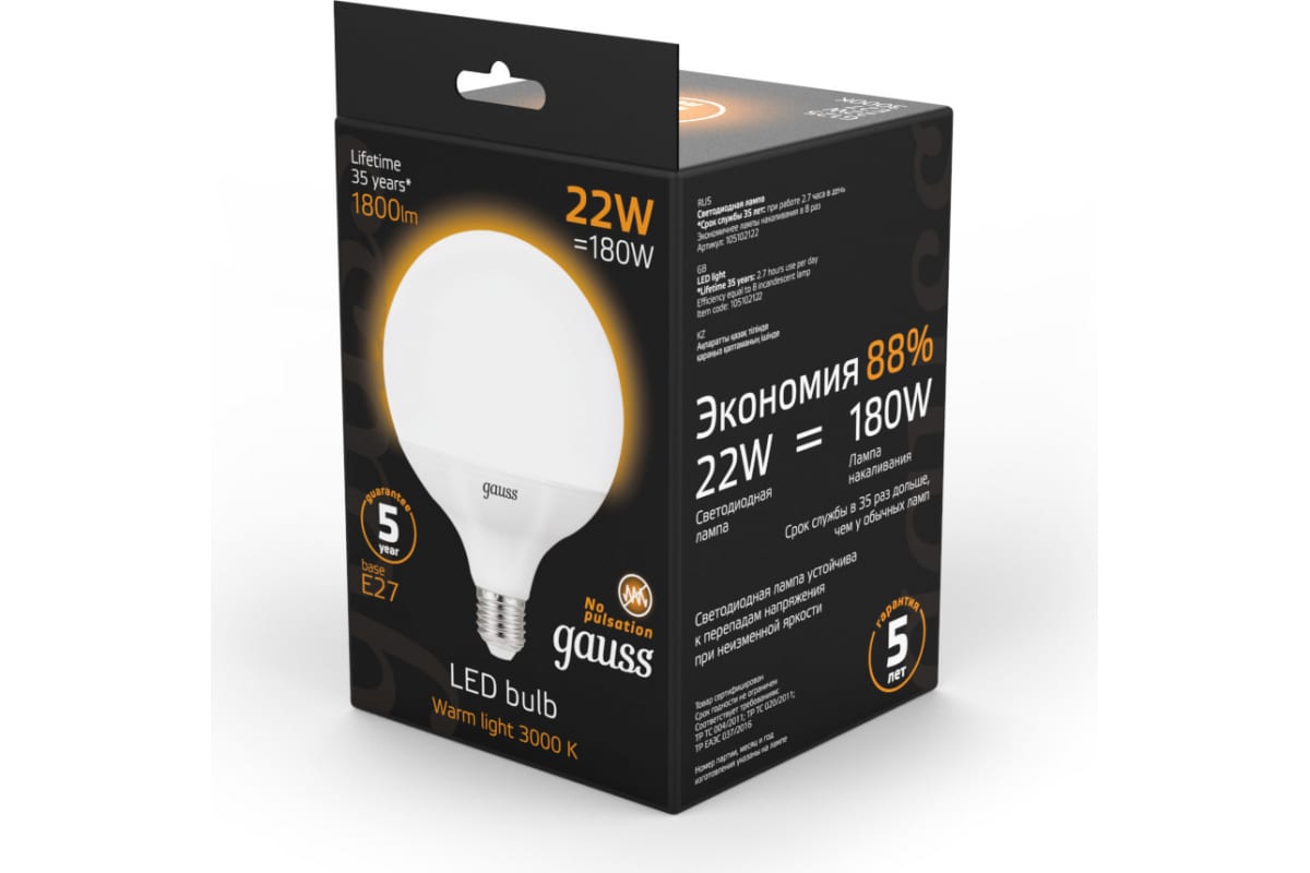 Лампа св. Е27 22Вт GAUSS 3000К G125 шар 1800лм GAUSS 105102122