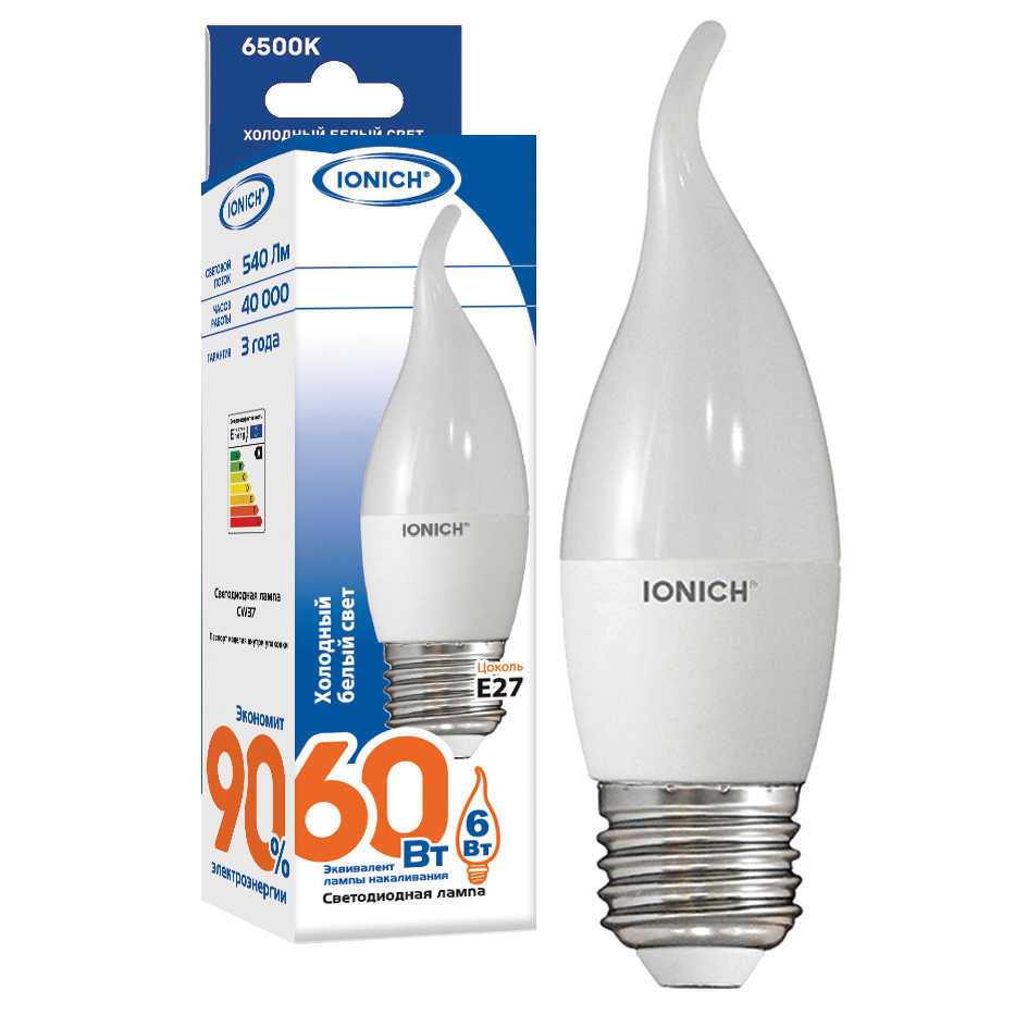 - Лампа св. Е27 6Вт Cвеча на ветру IONICH ILED-SMD2835-CW37-6Вт-540Лм-220В-6500К-E27 | 10/100 в упак.