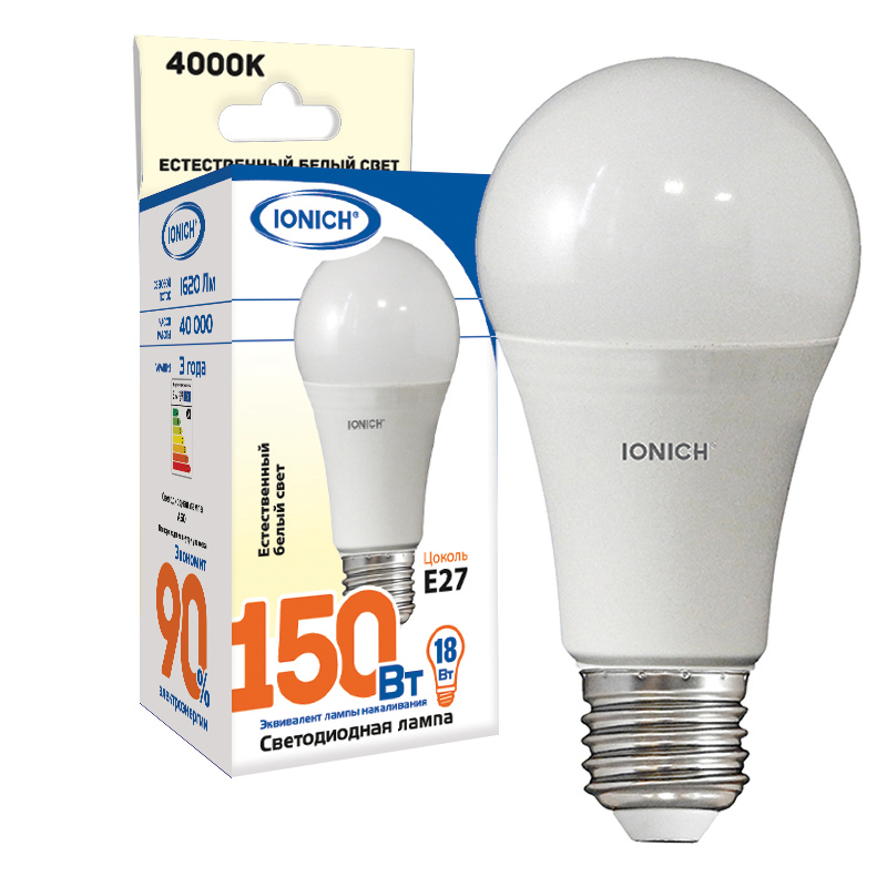 - Лампа св. Е27 18Вт IONICH 4000К ILED-SMD2835-A60-18Вт-1500Лм-230В-4000К-E27 | 10/100 в упак.
