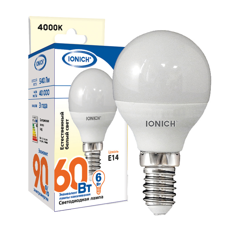 Лампа св. Е14 6Вт Шар IONICH 4000/К ILED-SMD2835-P45-6Вт-540Лм-220В| 10/100 в упак.