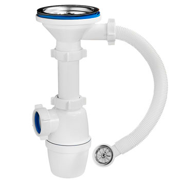Сифон с большим корпусом и отстойником, выпуском с нержавеющей чашкой д.114мм для мойки с круглым переливом. Необходим отвод в канализацию.